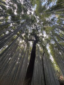 In November 2025 I went to Japan and a special moment was in the bamboo grove near Kyoto. We left Kyoto by train to Arashiyama. The bamboo grove was very calming. The tall bamboo appeared majestic in a way – it was awesome wandering through beside the towering bamboo. We got there fairly early in the morning as we heard it might get very crowded. The experience was magical and especially when we came to a section where a man was playing a Japanese instrument which I think was a Japanese bamboo flute. It has inspired me to draw on that experience with charcoal, ink and gouche artworks.